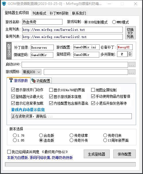 免费好用老Gom登录器+防劫持【防毒防劫持版】 软件版本:1.0 软件大小:16.1MB 更新日期:2024-08-16 下载次数:2046 安全下载 详细介绍 免费好用老Gom登录器+防劫持【防毒防劫持版】1.0说明:本配置器为网络收集源码,属于二次开发,专门给白嫖gm兄弟使用,不做任何商业盈利。请勿用于非法操作所带来的侵权后果和我们无任何。打赏打赏是一种认可,感谢您,让我们有了更多的力量去分享价值。